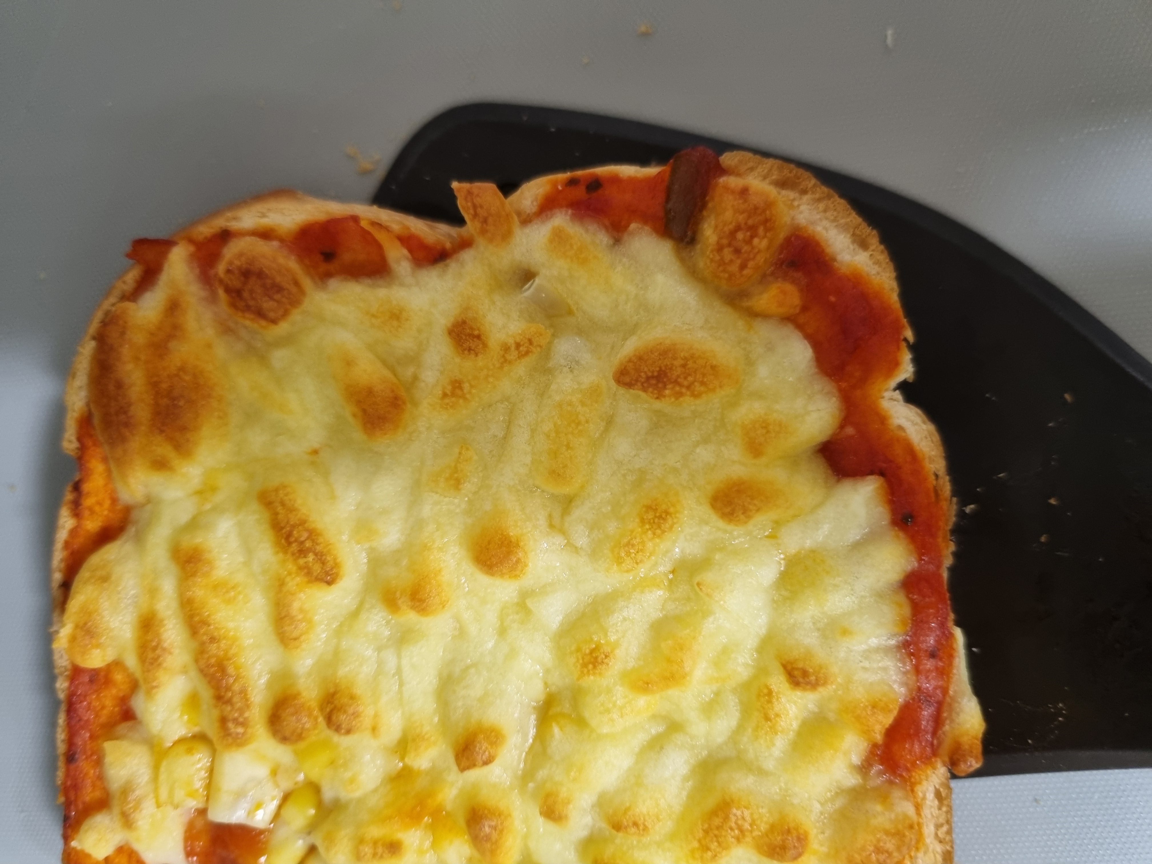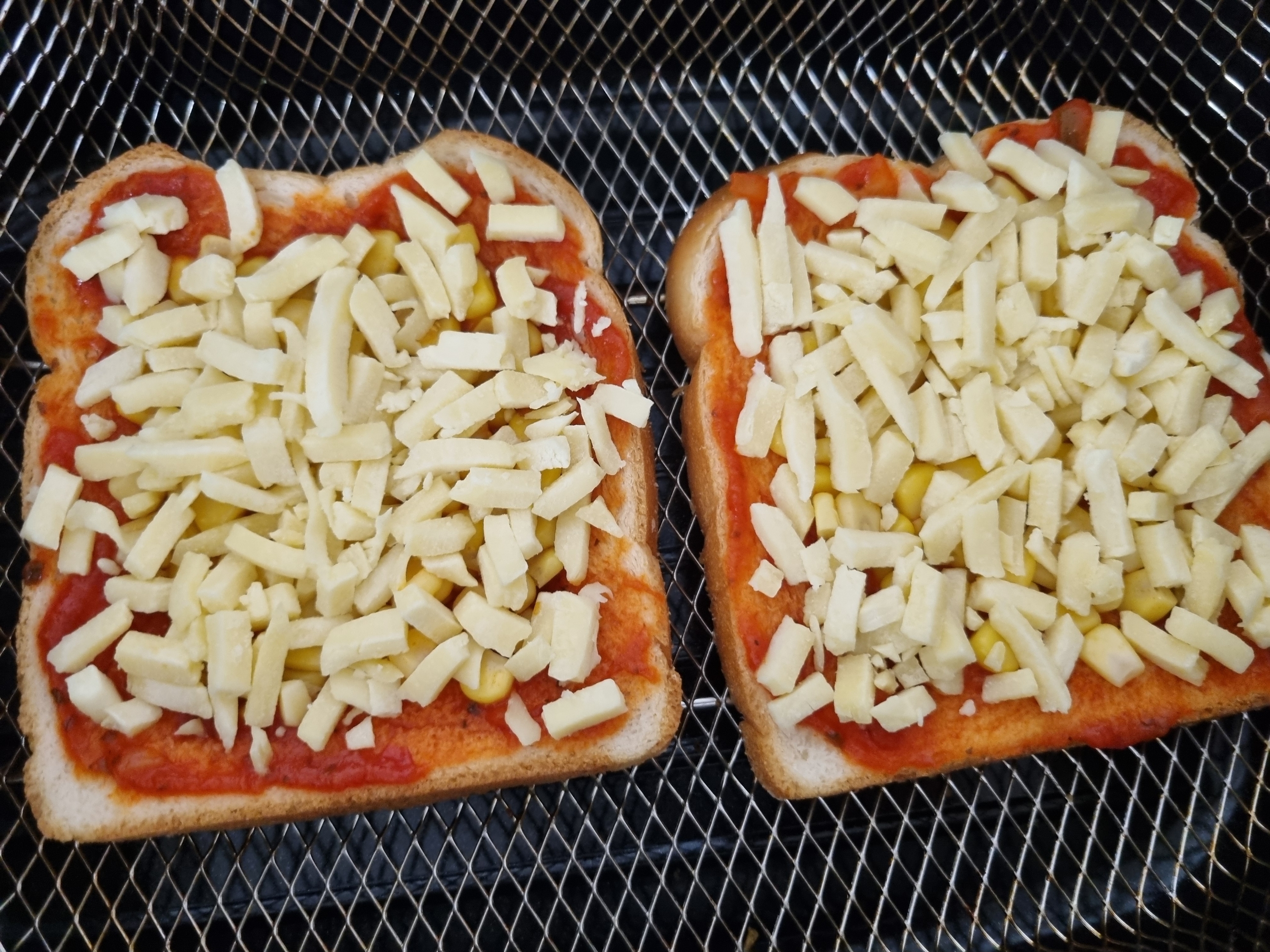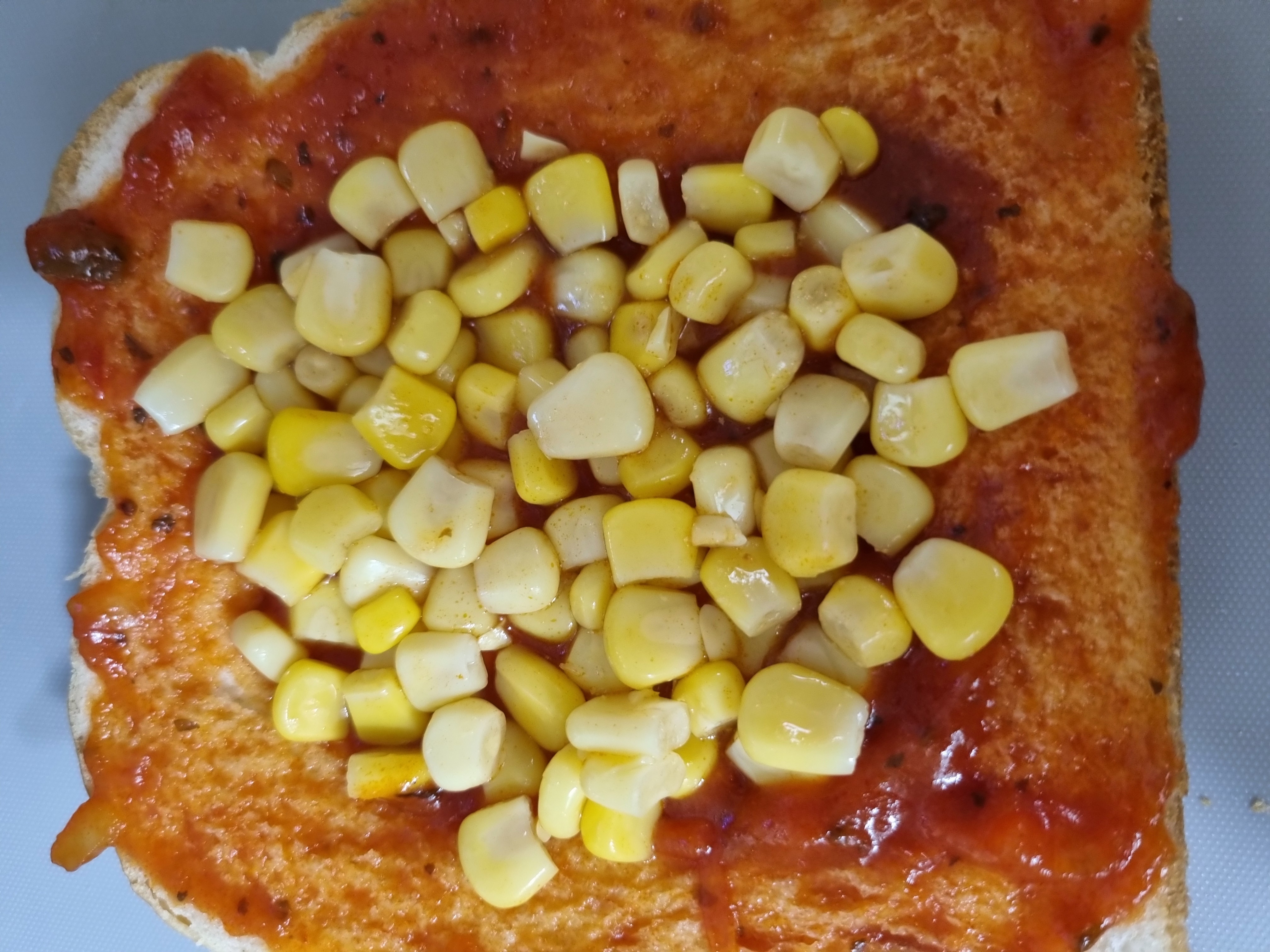 ( 나는 식빵 가운데를 수저로 꾹꾹 눌러서 홈을 만들어두고 그 위에 콘옥수수를 듬뿍 올려줬다.)