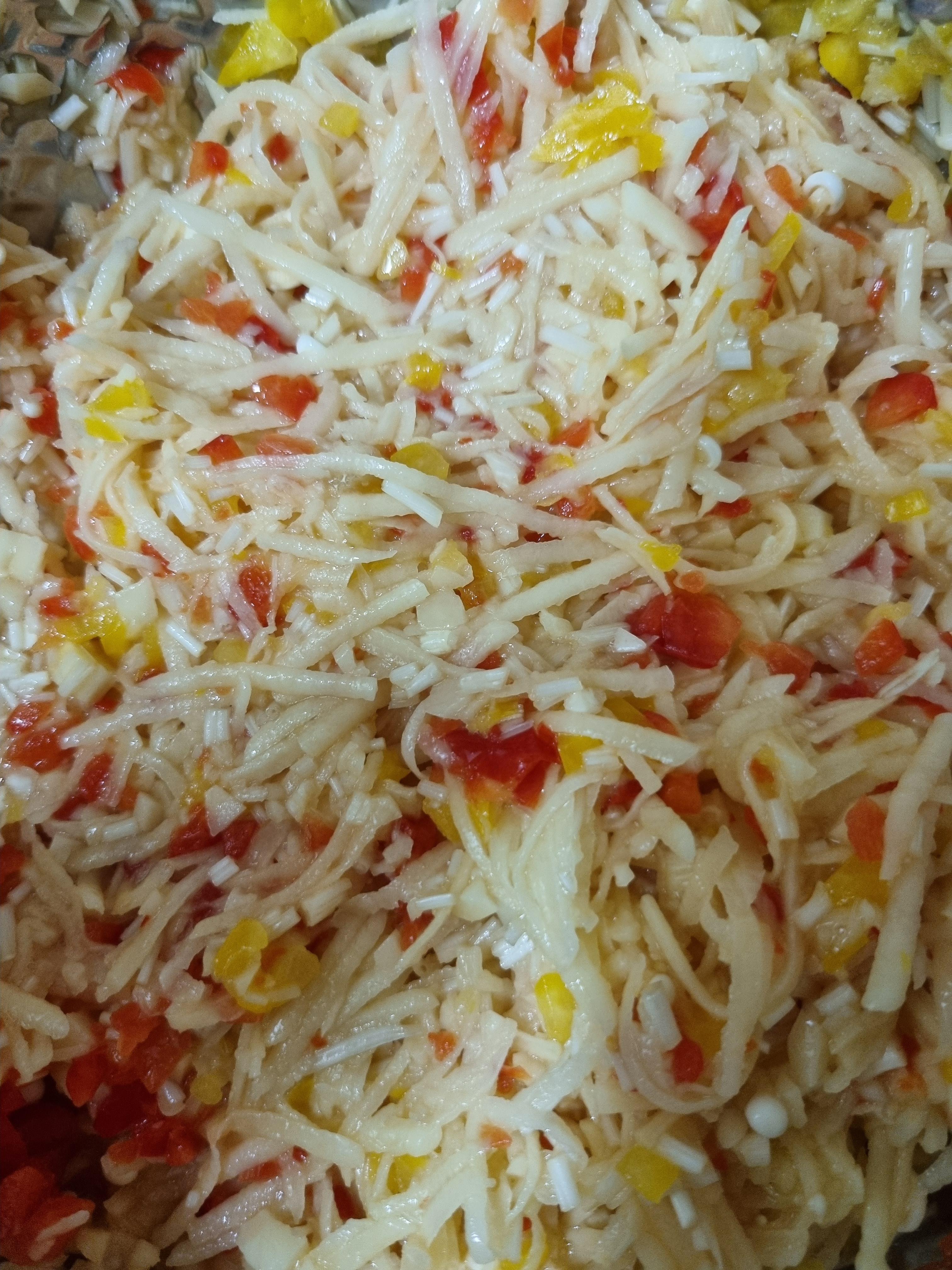 5. 계란 2개, 소금 티스푼으로 1스푼, 부침가루나 밀가루 조금 넣고 잘 뒤적거리며 섞는다.
