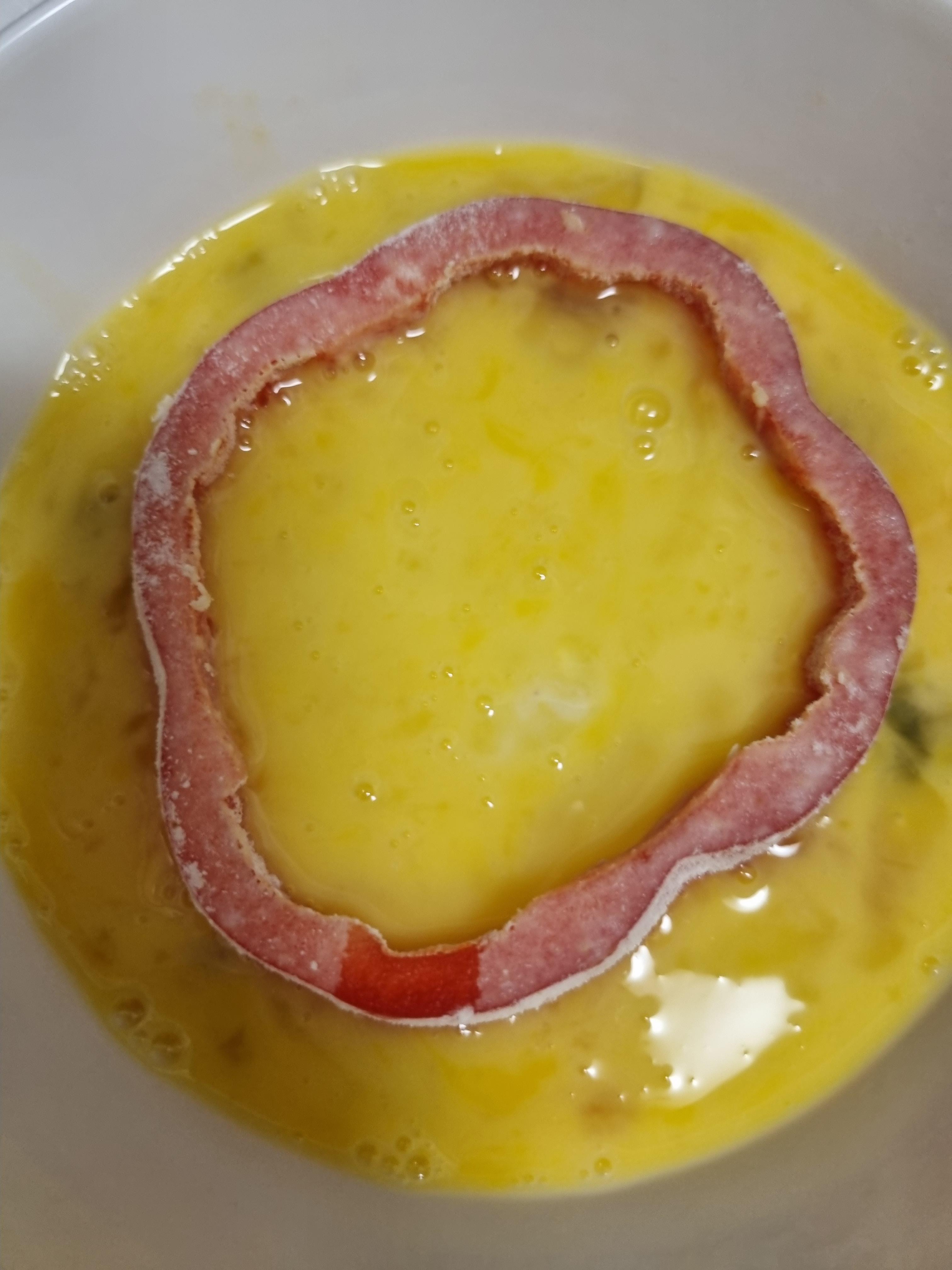 7. 파프리카에 부침가루 ⇨ 계란 순으로 묻혀서 기름에 달궈진 팬 위에 올린다.