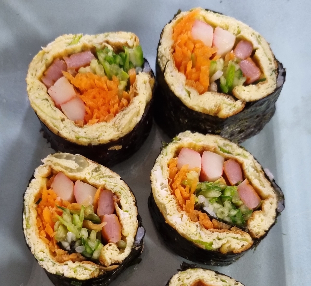 *️⃣ 계란부침으로 하면 더 맛있긴 한데, 키친타월로 기름기를 아주 잘 뺀 다음에 김밥을 말아야 한다. 김이 눅눅해져서 칼질도 안되어 잘 썰리지도 않고, 김이 벗겨지고 난리도 아니어서 결국 김 2장을 겹쳐서 김밥을 쌌다. 그래서 다음엔 그냥 기름 없이 계란지단을 부쳐서 해볼 생각이다.
