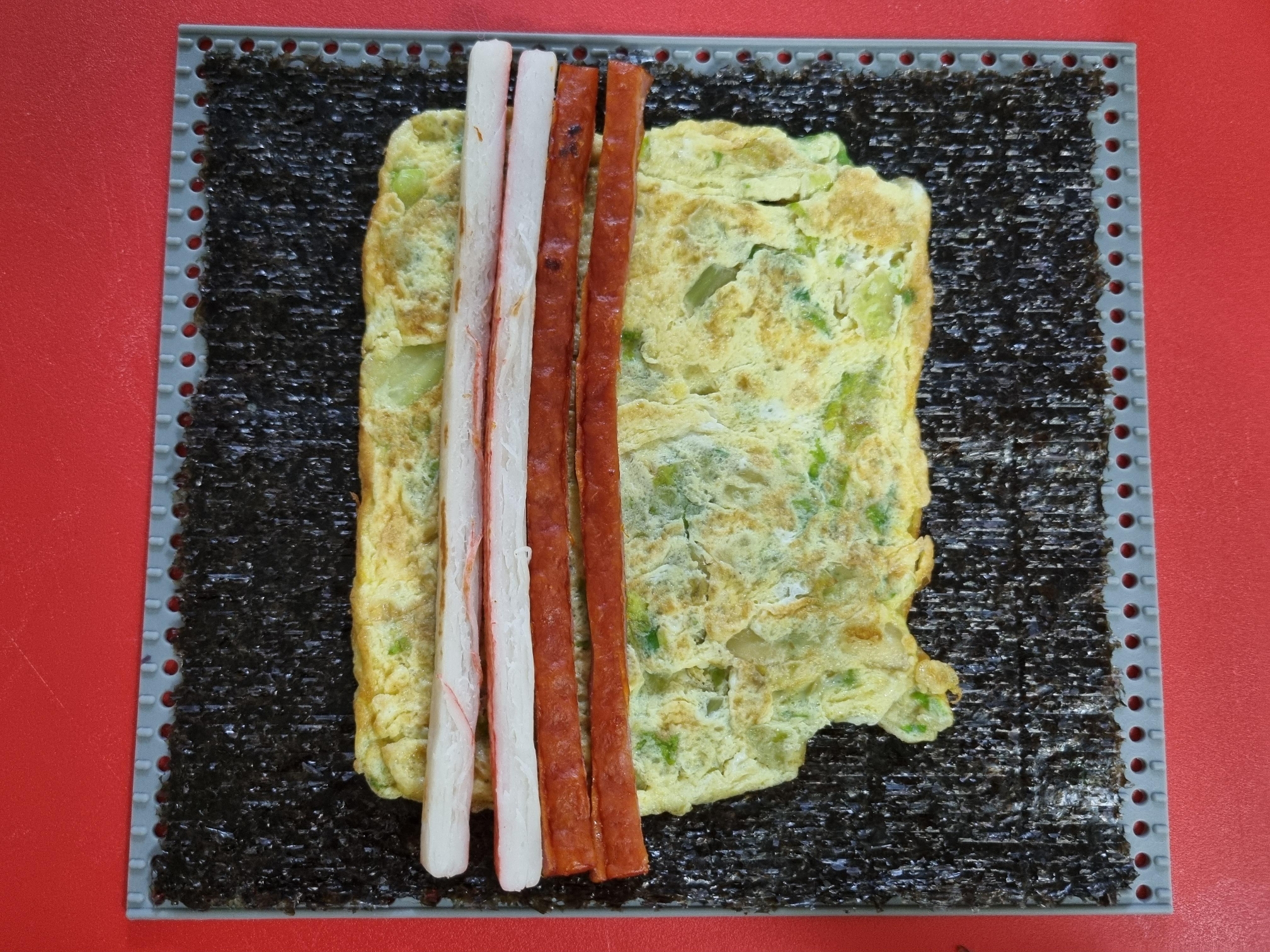 3. 김 위에 계란부침 ⇨ 햄과 맛살 ⇨ 오이와 당근을 순서대로 올린다.